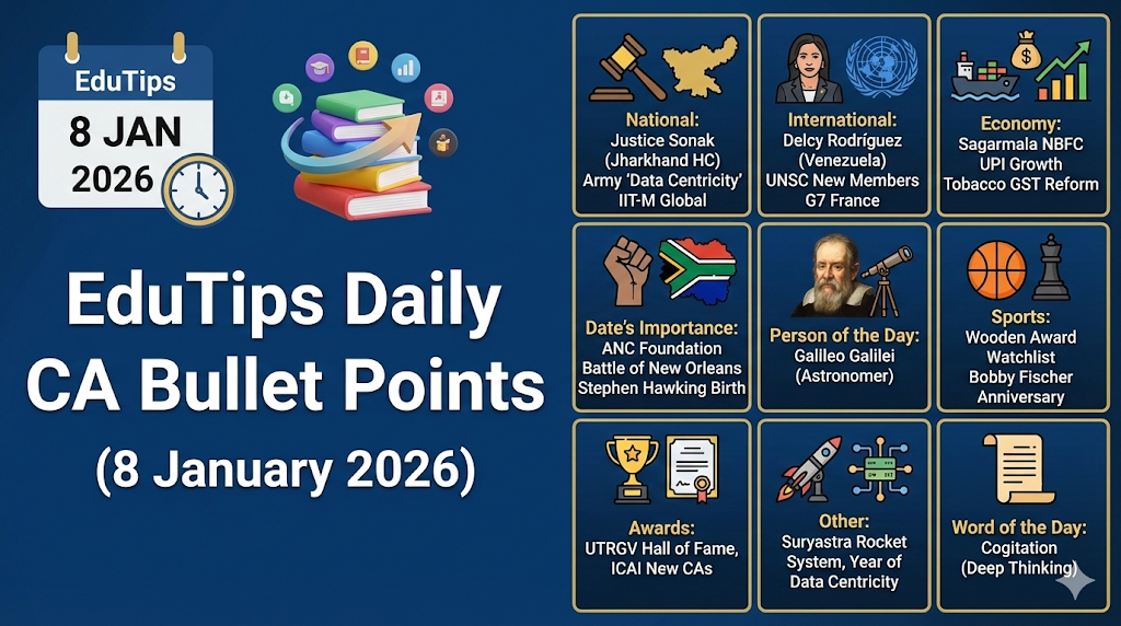 - New Chief Justice of Jharkhand HC: Justice Mahesh Sharadchandra Sonak is sworn in as the Chief Justice of the Jharkhand High Court today, 8 January 2026, succeeding Justice Tarlok Singh Chauhan.