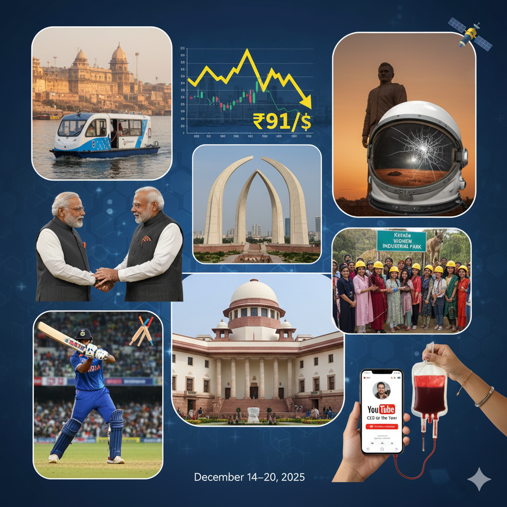 Stay informed with our weekly wrap-up of the most significant developments from 14 December to 20 December 2025. This week's highlights include India’s strategic diplomatic missions to Ethiopia and Oman, major legislative reforms in education and labour, and the Indian Rupee reaching a historic low. From green energy milestones in Varanasi to India’s rising dominance in global AI, this digest covers the essential updates across National, International, Economy, and Sports sectors.